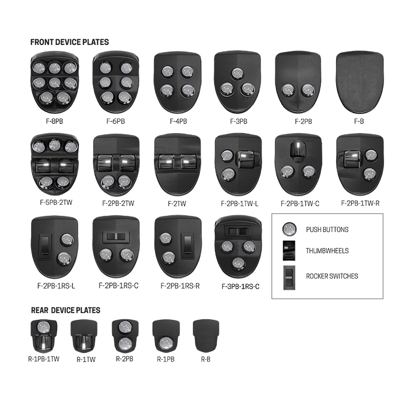 4 standard rear device plates are available with optional button and thumbwheel combinations. Optional push buttons in trigger location are also available.